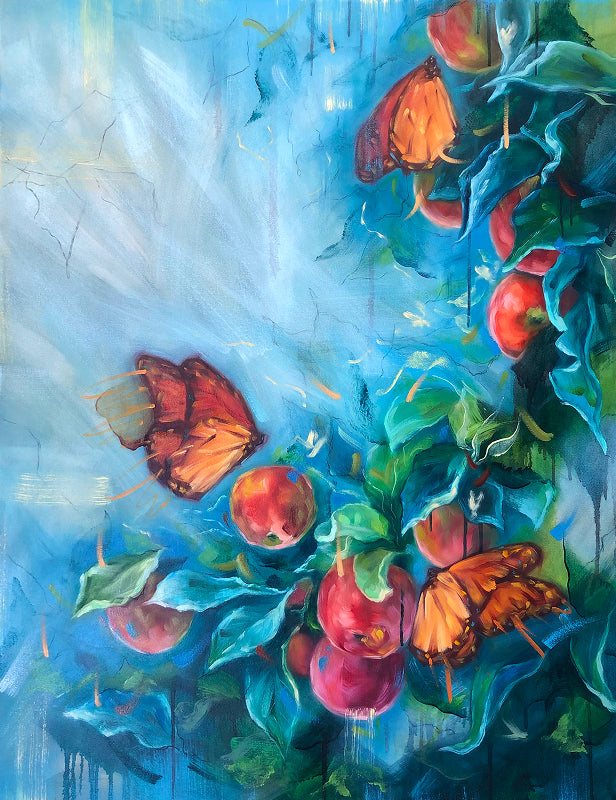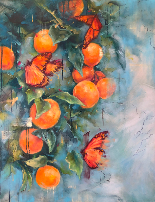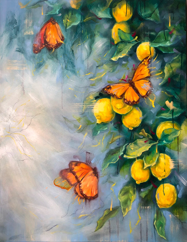 This painting is a total blend of my favourite things, the sweet smell of summer, the vibrant colours from my trips to the Mediterranean, wineries and orchards, and the beautiful monarch butterfly’s I see right here in my own backyard.